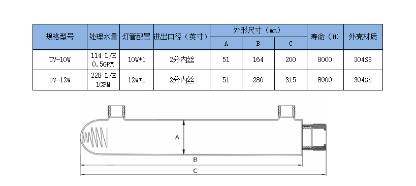 紫外线杀菌器主体内外均采用304SS#不锈钢材质,主体内外部抛光处理以加强紫外线辐照强度以高纯度石英套管组装而成,配合水处理专用紫外线灯管,具有杀菌力强,寿命长,运行稳定可靠,其杀菌效率≥99%,使用寿命8000小时,