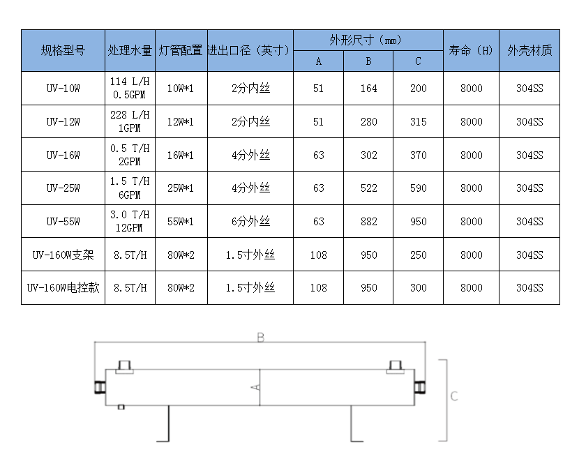 紫外线杀菌器主体内外均采用304SS#不锈钢材质,主体内外部抛光处理以加强紫外线辐照强度以高纯度石英套管组装而成,配合水处理专用紫外线灯管,具有杀菌力强,寿命长,运行稳定可靠,其杀菌效率≥99%,使用寿命8000小时,